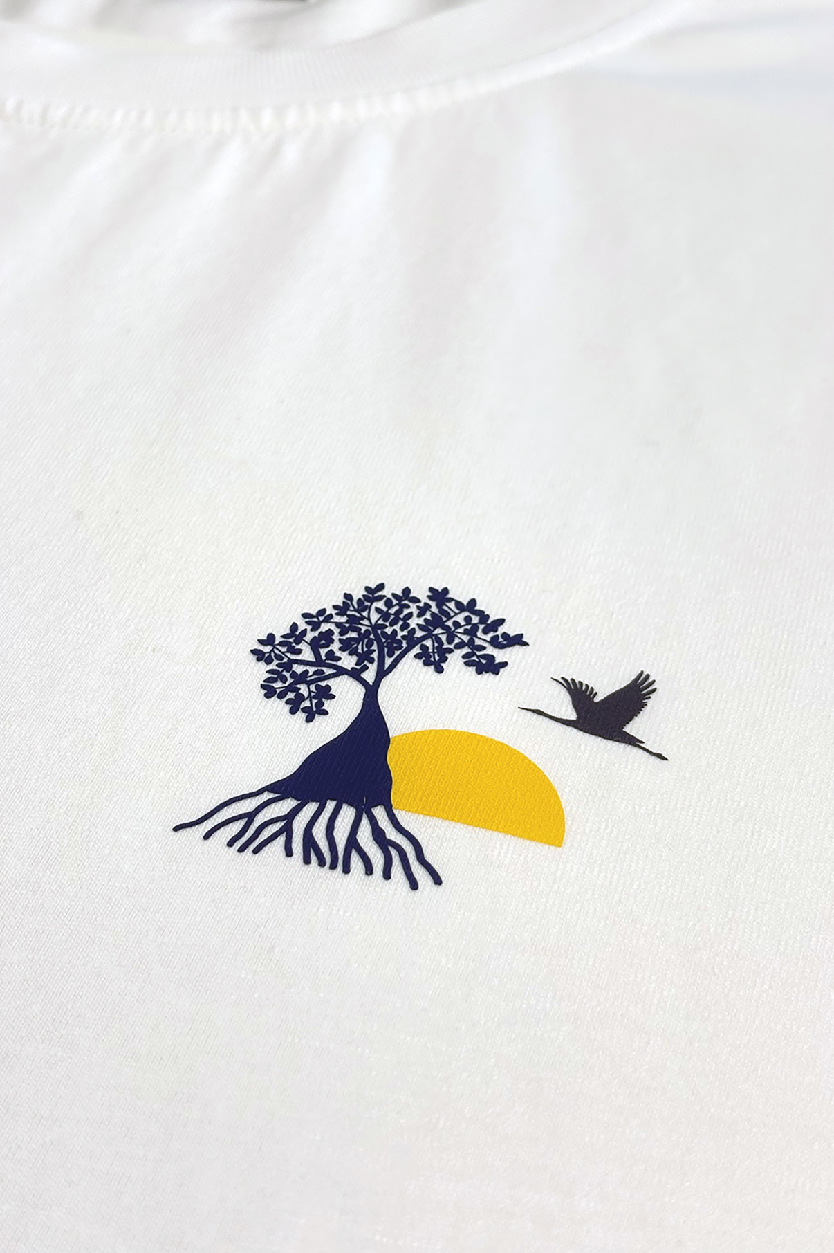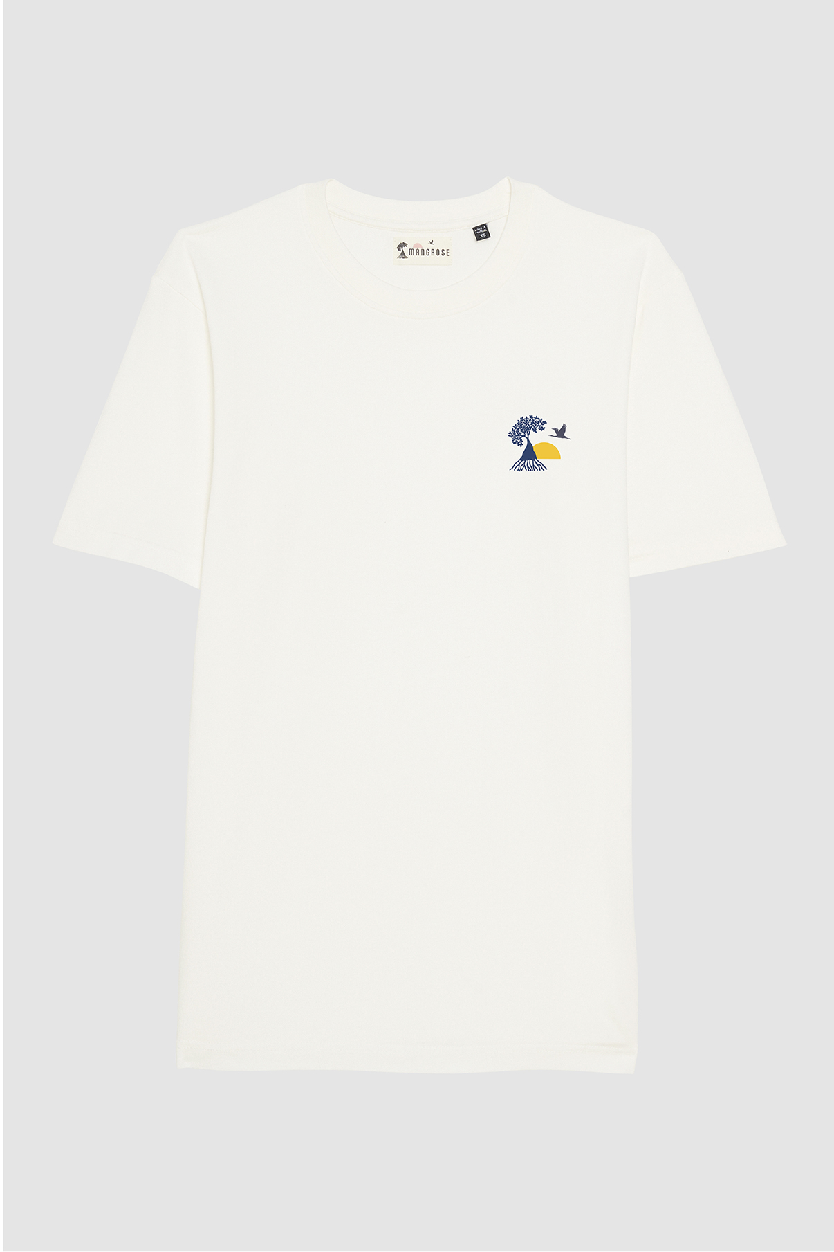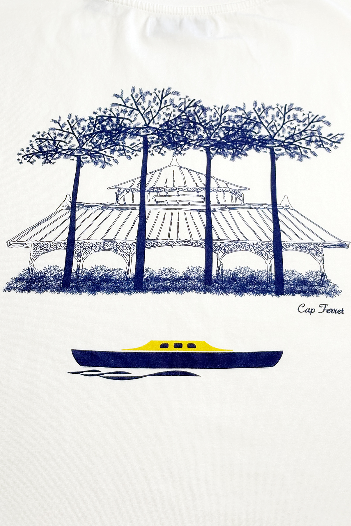 Ce modèle joue sur le contraste entre un logo Mangrose discret à l’avant et une grande villa bleue dans le dos, inspirée du Cap Ferret.