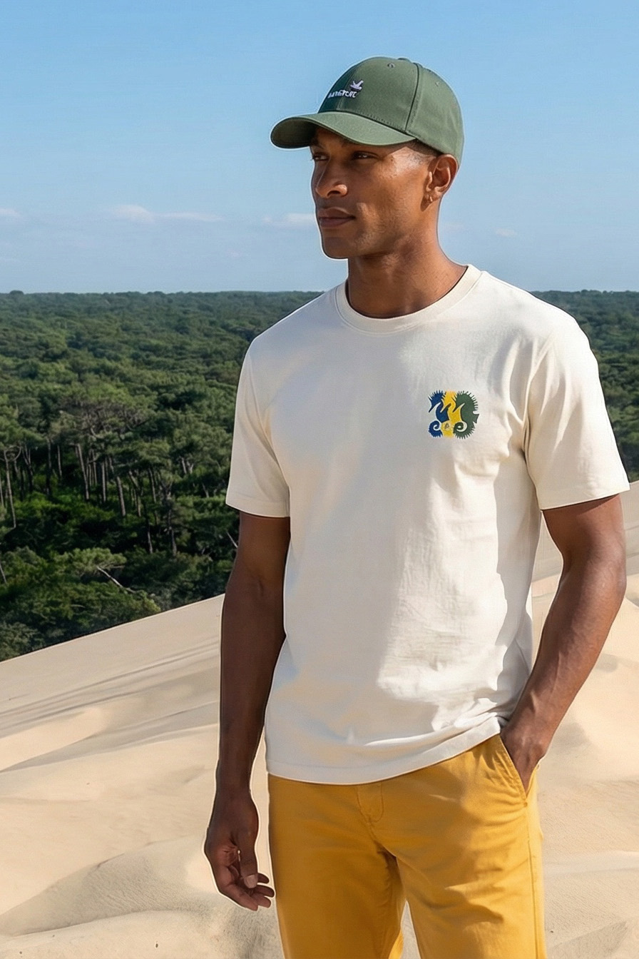Ce modèle met à l’honneur l’hippocampe, emblème du Bassin d’Arcachon, revisité aux couleurs du Cap Ferret : bleu, jaune et vert.