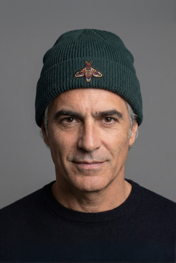 This beanie celebrates the Mangrose Bee, a symbol of life, color, and biodiversity.